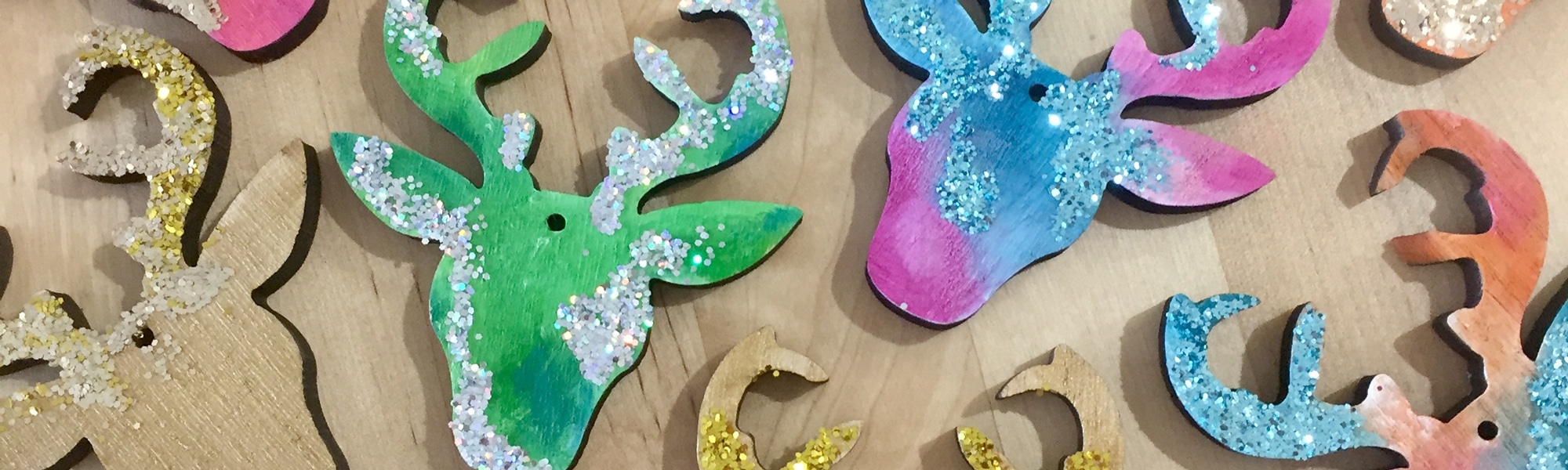 1. Lay your wooden reindeers out on a table and paint them with your choice of acrylic paint colour combinations.